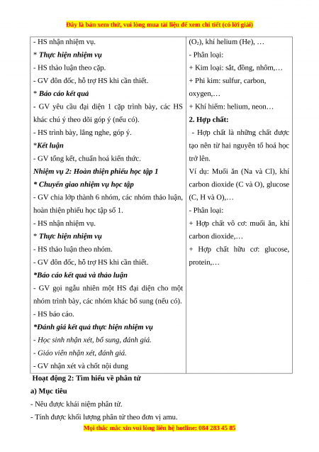- Giúp học sinh xác định được vấn đề cần học tập là tìm hiểu phân tử, hợp chất, đơn chất. b) Nội dung