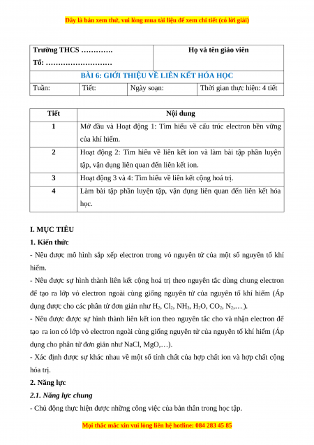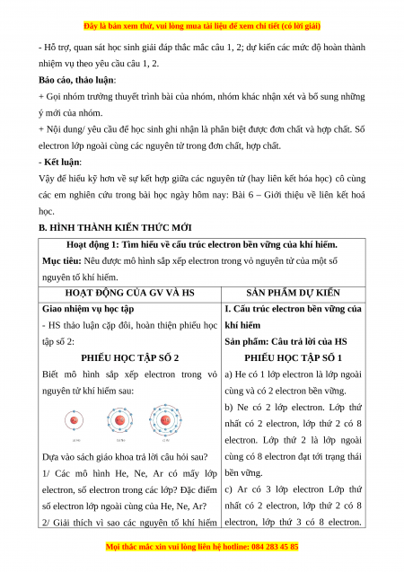 Giáo án Hóa học 7 Kết nối tri thức Bài 6: Giới thiệu về liên kết hóa học