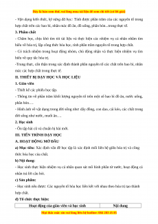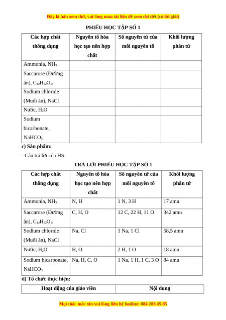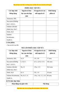 PHIẾU HỌC TẬP SỐ 1 Các hợp chất Nguyên tố hóa Số nguyên tử của Khối lượng thông dụng học tạo nên hợp mỗi nguyên tố phân tử chất Ammonia, NH3 Saccarose (Đường ăn), C12H22O11 Sodium chloride (Muối ăn), NaCl Nước, H2O Sodium bicarbonate, NaHCO3 c) Sản phẩm: - Câu trả lời của HS.