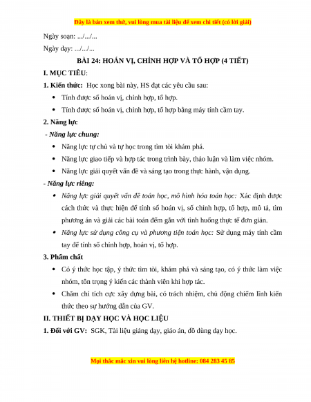 BÀI 24: HOÁN VỊ, CHỈNH HỢP VÀ TỔ HỢP (4 TIẾT) I. MỤC TIÊU: