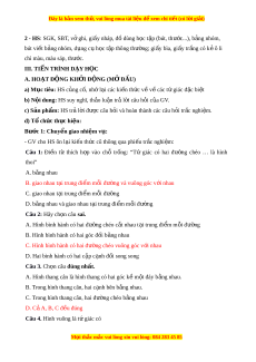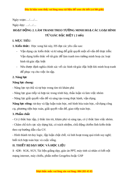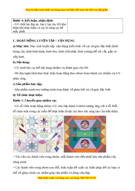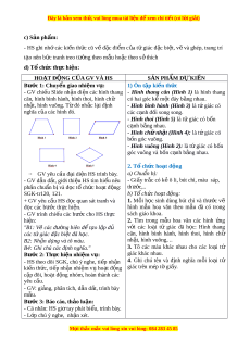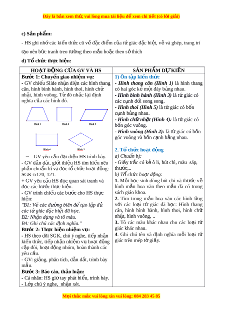 Đây là bản xem th , vu ử i lòng mua tài li u ệ đ xe ể m chi ti t ế (có l i ờ gi i ả ) c) S n ả ph m ẩ : - HS ghi nh ớ các ki n ế th c ứ cũ v ề đ c ặ đi m ể c a ủ t ứ giác đ c ặ bi t ệ , v ẽ và ghép, trang trí t o ạ nên b c ứ tranh treo t n ườ g theo m u ẫ ho c ặ theo s ở thích d) T ổ ch c ứ th c ự hi n: ệ HOẠT ĐỘNG C A Ủ GV VÀ HS SẢN PHẨM D Ự KI N Ế Bư c ớ 1: Chuy n ể giao nhi m ệ v : ụ 1) Ôn t p ậ ki n ế th c ứ - GV chi u ế Slide nh n ậ di n