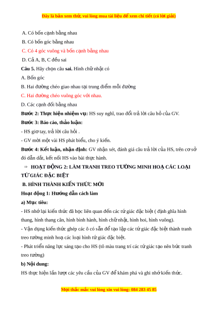 Đây là bản xem th , vu ử i lòng mua tài li u ệ đ xe ể m chi ti t ế (có l i ờ gi i ả ) A. Có b n ố c n ạ h b n ằ g nhau B. Có b n ố góc b n ằ g nhau C. Có 4 góc vuông và b n ố c n ạ h b n ằ g nhau D. Cả A, B, C đ u ề sai Câu 5. Hãy ch n ọ câu sai. Hình ch ữ nh t ậ có A. B n ố góc B. Hai đ n ườ g chéo giao nhau t i ạ trung đi m ể m i ỗ đ n ườ g C. Hai đ n ườ g chéo vuông góc v i ớ nhau. D. Các c n ạ h đ i ố b n ằ g nhau Bư c ớ 2: Th c ự hi n ệ nhi m ệ v :