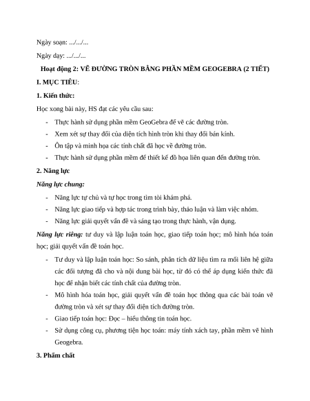 Hoạt động 2: VẼ ĐƯỜNG TRÒN BẰNG PHẦN MỀM GEOGEBRA (2 TIẾT) I. MỤC TIÊU: