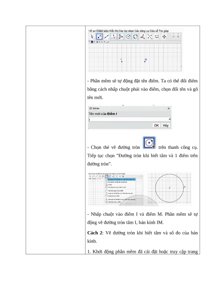 - GV mở phần mềm và giới Cách 1: Vẽ đường tròn khi biết tâm và một điểm trên