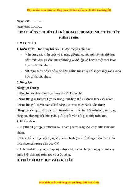 Đây là bản xem th , vu ử i lòng mua tài li u ệ đ xe ể m chi ti t ế (có l i ờ gi i ả ) Ngày so n ạ :…/…./… Ngày d y ạ : …/…/… HOẠT ĐỘNG 3. THI T Ế L P Ậ K Ế HO C Ạ H CHO M T Ộ M C Ụ TIÊU TI T Ế KIỆM ( 1 ti t) ế I. MỤC TIÊU: 1. Ki n ế th c: ứ H c ọ xong bài này, HS đ t ạ các yêu c u ầ sau: - V n ậ d n ụ g các ki n ế th c ứ và kĩ năng đ ể gi i ả quy t ế m t ộ s ố v n ấ đ ề th c ự ti n ễ : V n ậ d n ụ g ki n ế th c ứ v ề th n ố g kê đ ể l p ậ k ế ho ch ạ m t ộ cách khoa h c ọ và thuy t ế ph c. ụ - S ử d n ụ g bi u ể đ ồ và b n ả g s ố li u ệ nh m ằ trình bày k ế ho c ạ h m t ộ cách khoa h c ọ và thuy t ế ph c. ụ 2. Năng l c ự Năng l c ự chung: - Năng l c ự t ự ch ủ và t ự h c ọ trong tìm tòi khám phá - Năng l c ự giao ti p ế và h p