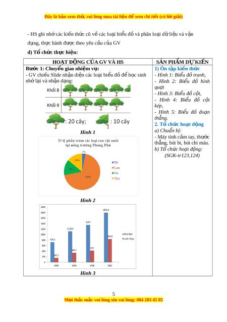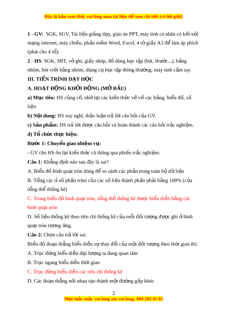 ỏ và hoàn thành các câu h i ỏ tr c ắ nghi m. ệ d) T ổ ch c ứ th c ự hi n: ệ Bư c ớ 1: Chuy n ể giao nhi m ệ v : ụ - GV cho HS ôn l i ạ ki n ế th c ứ cũ thông qua phi u ế tr c ắ nghi m ệ : Câu 1: Kh n ẳ g đ n ị h nào sau đây là sai? A. Bi u ể đồ hình qu t ạ tròn dùng đ ể so sánh các ph n ầ trong toàn b ộ d ữ li u ệ B. Tổng các t ỉs ố ph n ầ trăm c a ủ các s ố li u ệ thành ph n ầ ph i ả b n ằ g 100% (c a ủ t n ổ g th ể th n ố g kê) C. Trong bi u ể đ ồ hình qu t ạ tròn, t n ổ g thể thống kê đ c ượ bi u ể di n ễ b n ằ g các hình qu t ạ tròn D. Số li u ệ th n ố g kê theo tiêu chí th n ố g kê c a ủ m i ỗ đ i ố t n ượ g đ c ượ ghi ở hình qu t ạ tròn t n ươ g n ứ g. Câu 2: Ch n ọ câu tr ả l i ờ sai: Bi u ể đ ồ đo n ạ th n ẳ g bi u ể di n ễ s ự thay đ i ổ c a ủ m t ộ đ i ố t n ượ g theo th i ờ gian thì: A. Tr c ụ đ n ứ g bi u ể di n ễ đ i ạ l n ượ g ta đang quan tâm B. Tr c ụ ngang bi u ể di n ễ th i ờ gian C. Tr c ụ đ n ứ g bi u ể di n ễ các tiêu chí th n ố g kê D. Các đo n ạ th n ẳ g n i ố nhau t o ạ thành m t ộ đ n ườ g g p ấ khúc 2 M i