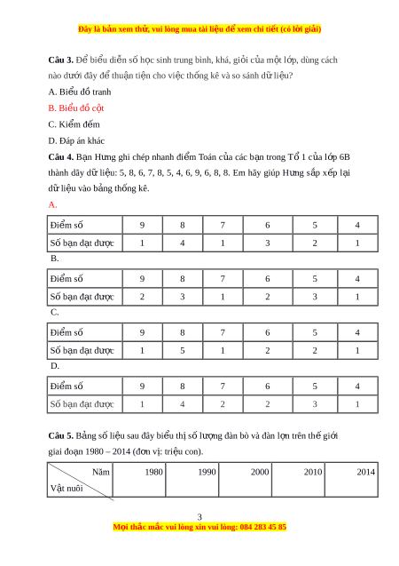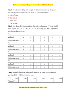 ệ : 5, 8, 6, 7, 8, 5, 4, 6, 9, 6, 8, 8. Em hãy giúp H n ư g s p ắ x p ế l i ạ d ữ li u ệ vào b n ả g th n ố g kê. A. Đi m ể số 9 8 7 6 5 4 Số b n ạ đ t ạ đ c ượ 1 4 1 3 2 1 B. Đi m ể số 9 8 7 6 5 4 Số b n ạ đ t ạ đ c ượ 2 3 1 2 3 1 C. Đi m ể số 9 8 7 6 5 4 Số b n ạ đ t ạ đ c ượ 1 5 1 2 2 1 D. Đi m ể số 9 8 7 6 5 4 Số b n ạ đ t ạ đ c ượ 1 4 2 2 3 1 Câu 5. B n ả g số li u ệ sau đây bi u ể th ịs ố l n
