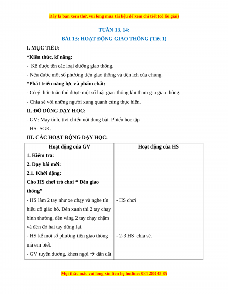 BÀI 13: HOẠT ĐỘNG GIAO THÔNG (Tiết 1) I. MỤC TIÊU: