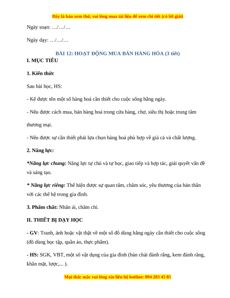 BÀI 12: HOẠT ĐỘNG MUA BÁN HÀNG HÓA (3 tiết) I. MỤC TIÊU 1. Kiến thức Sau bài học, HS: