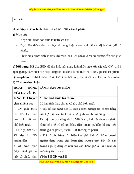 nghe giảng, thực hiện các hoạt động tìm hiểu các hình thức trả cổ tức, giá của cổ phiếu.