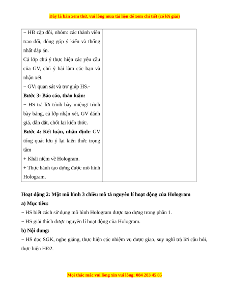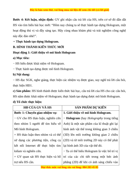 − Thực hành tạo dựng được mô hình Hologram. b) Nội dung: