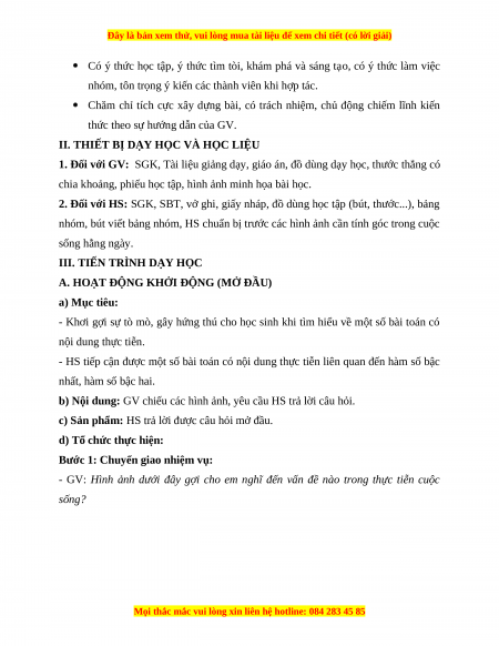 - HS tiếp cận được một số bài toán có nội dung thực tiễn liên quan đến hàm số bậc nhất, hàm số bậc hai.