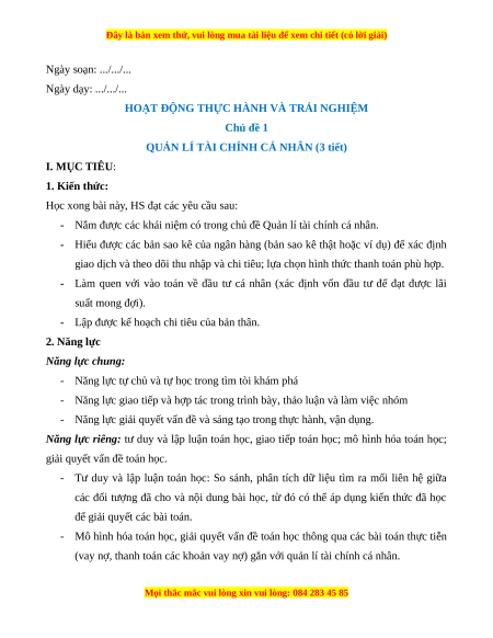 Giáo án Hoạt đông thực hành và trải nghiệm: Quản lí tài chính cá nhân Toán 8 Cánh diều