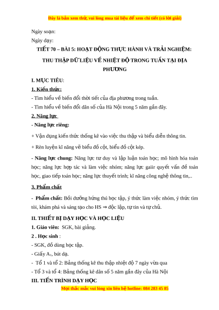 TIẾT 70 – BÀI 5: HOẠT Đ N Ộ G TH C Ự HÀNH VÀ TR I Ả NGHI M: Ệ THU TH P Ậ DỮ LI U Ệ V N Ề HI T Ệ Đ Ộ TRONG TU N Ầ T I Ạ Đ A Ị PHƯ N Ơ G I. M C Ụ TIÊU: 1. Ki n t ế h c ứ : - Tìm hi u v ể bi ề n ế đổi th i ờ ti t ế c a ủ đ a ị phư ng t ơ rong tu n. ầ - Tìm hi u v ể bi ề n ế đổi dân số c a ủ Hà N i ộ trong 5 năm g n đây ầ . 2. Năng l c ự - Năng l c ri ự êng: + V n ậ d ng ki ụ n t ế h c t ứ h ng kê vào vi ố c t ệ hu th p và ậ bi u di ể n t ễ hông tin. + Rèn luy n kĩ ệ năng v bi ẽ u đ ể ồ c t ộ , bi u đ ể ồ c t ộ kép. - Năng l c ự chung: Năng l c ự tư duy và l p ậ lu n ậ toán h c; ọ mô hình hóa toán h c; ọ năng l c ự h p ợ tác và làm vi c ệ nhóm; năng l c ự gaiir quy t ế v n ấ đề toán h c, gi ọ ao ti p t ế oán h c; ọ năng l c t ự huy t