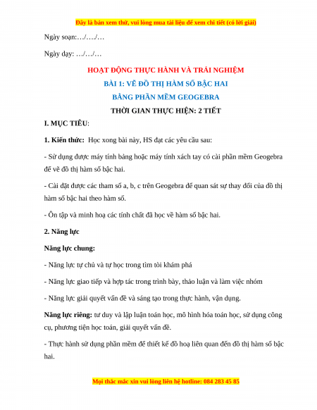 - Ôn tập và minh hoạ các tính chất đã học về hàm số bậc hai. 2. Năng lực Năng lực chung:
