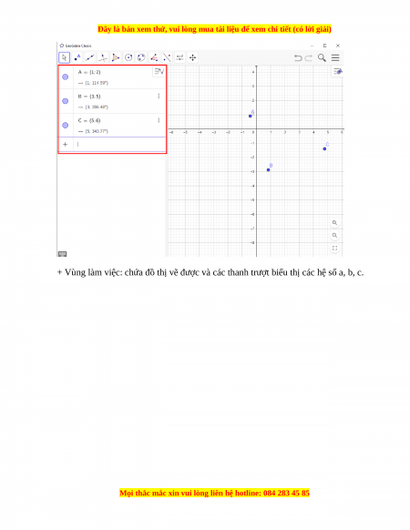 + Vùng làm việc: chứa đồ thị vẽ được và các thanh trượt biểu thị các hệ số a, b, c.