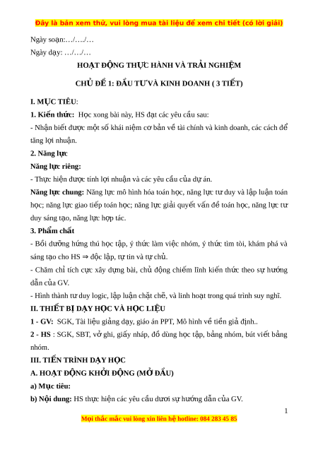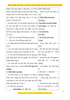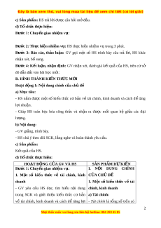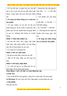 ề tài chính và kinh doanh, các cách để tăng l i ợ nhu n. ậ 2. Năng l c ự Năng l c ri ự êng: - Th c ự hi n đ ệ ư c ợ tính l i ợ nhu n và ậ các yêu c u c ầ a ủ d án. ự Năng l c ự chung: Năng l c ự mô hình hóa toán h c, ọ năng l c ự t ư duy và l p ậ lu n ậ toán h c; ọ năng l c ự giao ti p ế toán h c; ọ năng l c ự gi i ả quy t ế v n ấ đ ề toán h c, ọ năng l c ự tư duy sáng t o, năng ạ l c h ự p t ợ ác. 3. Phẩm ch t ấ - Bồi dư ng ỡ h ng ứ thú h c ọ t p, ậ ý th c ứ làm vi c ệ nhóm, ý th c ứ tìm tòi, khám phá và sáng t o cho ạ HS ⇒ đ c l ộ p, ậ t t ự in và t ch ự . ủ - Chăm chỉ tích c c ự xây d ng ự bài, chủ đ ng ộ chi m ế lĩnh ki n ế th c ứ theo sự hư ng ớ dẫn c a ủ GV. - Hình thành t duy l ư ogic, l p l ậ u n ậ ch t ặ ch , và ẽ linh ho t