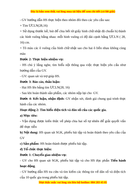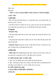 Đây là bản xem th , vu ử i lòng mua tài li u ệ đ xe ể m chi ti t ế (có l i ờ gi i ả ) Ngày so n: ạ Ngày d y: ạ TI T Ế 21 - BÀI 14: HO T Ạ Đ N Ộ G TH C Ự HÀNH VÀ TR I Ả NGHI M Ệ I. M C Ụ TIÊU: 1. Ki n t ế h c ứ : - Bi t ế chia hình chữ nh t ậ thành các ô vuông đ u ề nhau ( kích thư c ớ đư c ợ cho b i ở bài toán C Ư , C Ư LN) - Tìm hi u ể v ề dân số và di n ệ tích c a ủ các qu c ố gia, bi t ế cách tính m t ậ đ ộ dân số và nh n ậ bi t