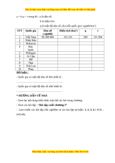 ậ xét, đánh giá chung quá trình th c ự hành c a các ủ nhóm. Hoạt đ ng 2: ộ Tìm hi u di ể n t ệ ích và dân s c ố a các ủ qu c gi ố a. a) M c t ụ iêu: - V n ậ d ng ụ đư c ợ ki n ế th c