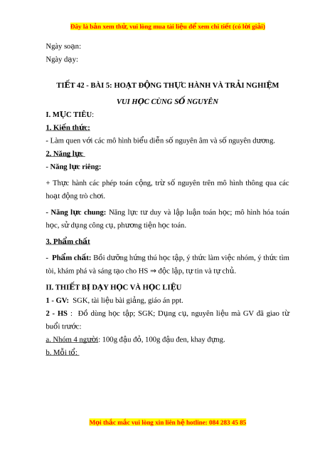 Đây là bản xem th , vu ử i lòng mua tài li u ệ đ xe ể m chi ti t ế (có l i ờ gi i ả ) Ngày so n: ạ Ngày d y: ạ TI T Ế 42 - BÀI 5: HO T Ạ Đ N Ộ G TH C Ự HÀNH VÀ TR I Ả NGHI M Ệ VUI H C Ọ CÙNG S N Ố GUYÊN I. M C Ụ TIÊU: 1. Ki n t ế h c ứ : - Làm quen v i ớ các mô hình bi u ể di n s ễ nguyên âm ố và s nguyên ố dư ng. ơ 2. Năng l c ự - Năng l c ri ự êng: + Th c