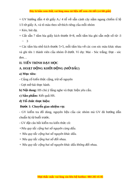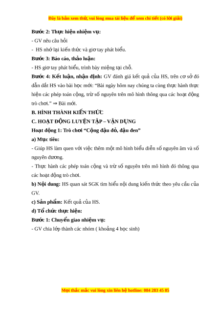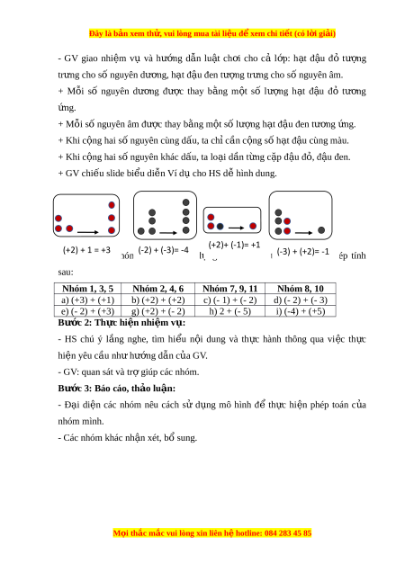 Đây là bản xem th , vu ử i lòng mua tài li u ệ đ xe ể m chi ti t ế (có l i ờ gi i ả ) - GV giao nhi m ệ vụ và hư ng ớ d n ẫ lu t ậ ch i ơ cho cả l p: ớ h t ạ đ u ậ đỏ tư ng ợ tr ng cho ư số nguyên dư ng, h ơ t ạ đ u đen t ậ ư ng ợ tr ng cho ư s nguyên âm ố . + Mỗi số nguyên dư ng ơ đư c ợ thay b ng ằ m t ộ số lư ng ợ h t ạ đ u ậ đỏ tư ng ơ ng. ứ + Mỗi s nguyên âm ố đư c ợ thay b ng m ằ t ộ số lư ng h ợ t ạ đ u ậ đen tư ng ơ ng. ứ + Khi c ng hai ộ s nguyên ố cùng d u, t ấ a ch c ỉ n c ầ ng ộ s h ố t ạ đ u ậ cùng màu. + Khi c ng hai ộ s nguyên ố khác d u, t ấ a lo i ạ d n t ầ ng c ừ p ặ đ u đ ậ , đ ỏ u ậ đen. + GV chi u ế slide bi u di ể n ễ Ví d cho H ụ S d hì ễ nh dung. (+2)+ (-1)= +1 - G (+V 2) cho + 1 các = +3 nhóm t(h-2) c ự + hành (-3)= sử -4 d ng ụ mô hình để th( c ự-3 )hi + ( n ệ+ các 2)= phép -1 tính sau: Nhóm 1, 3, 5 Nhóm 2, 4, 6 Nhóm 7, 9, 11 Nhóm 8, 10 a) (+3) + (+1) b) (+2) + (+2) c) (- 1) + (- 2) d) (- 2) + (- 3) e) (- 2) + (+3) g) (+2) + (- 2) h) 2 + (- 5) i) (-4) + (+5) Bư c ớ 2: Th c hi ự n nhi ệ m ệ v : ụ - HS chú ý l ng ắ nghe, tìm hi u ể n i ộ dung và th c ự hành thông qua vi c ệ th c ự hiện yêu cầu nh h ư ư ng d ớ ẫn c a G ủ V. - GV: quan sát và tr gi ợ úp các nhóm. Bư c