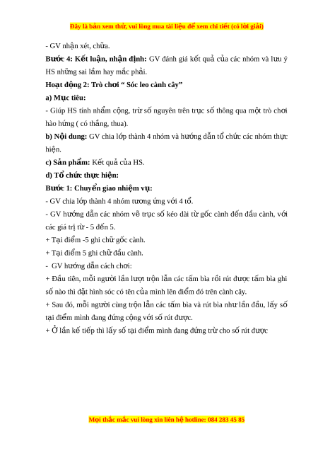 trừ số nguyên trên mô hình thông qua các ho t ạ đ ng t ộ rò ch i ơ . - Năng l c ự chung: Năng l c ự tư duy và l p ậ lu n ậ toán h c; ọ mô hình hóa toán h c, s ọ ử d ng công c ụ , ụ phư ng t ơ i n h ệ c t ọ oán. 3. Ph m ẩ chất - Phẩm ch t ấ : Bồi dư ng h ỡ ng t ứ hú h c ọ t p, ý t ậ h c l ứ àm vi c nhóm ệ , ý th c t ứ ìm