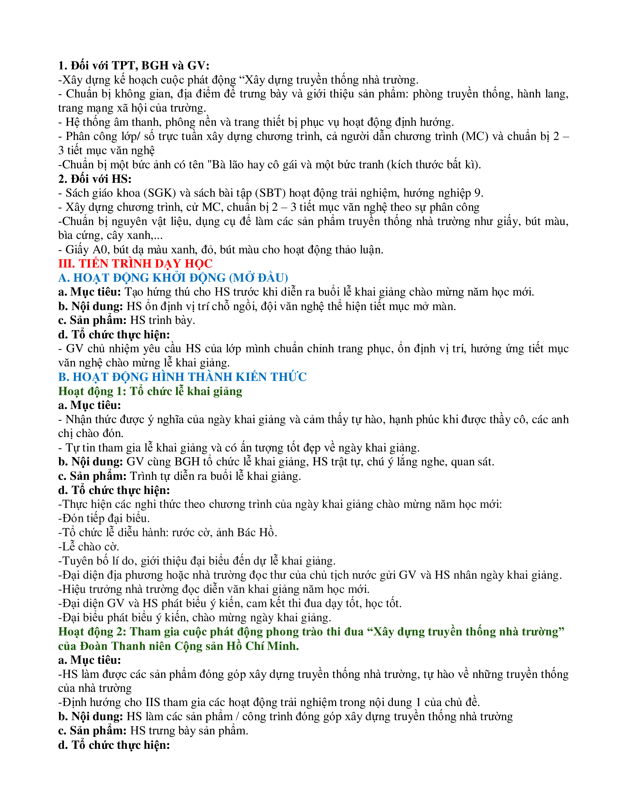 Hoạt động 1: Tổ chức lễ khai giảng a. Mục tiêu: