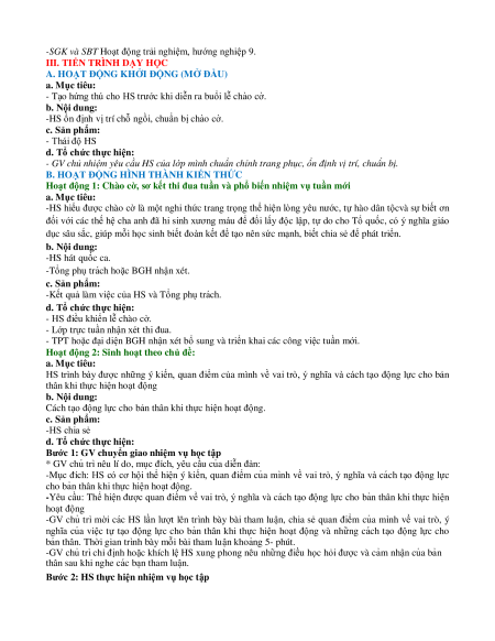 -HS ổn định vị trí chỗ ngồi, chuẩn bi ̣chào cờ. c. Sản phẩm: - Thái độ HS