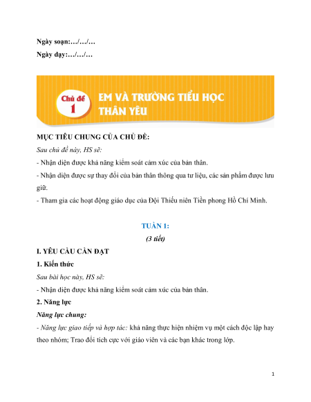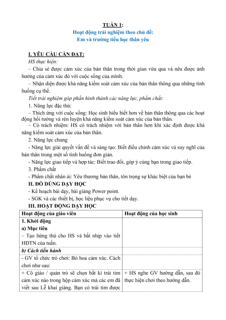 - Tham gia các hoạt động giáo dục của Đội Thiếu niên Tiền phong Hồ Chí Minh. TUẦN 1: (3 tiết)