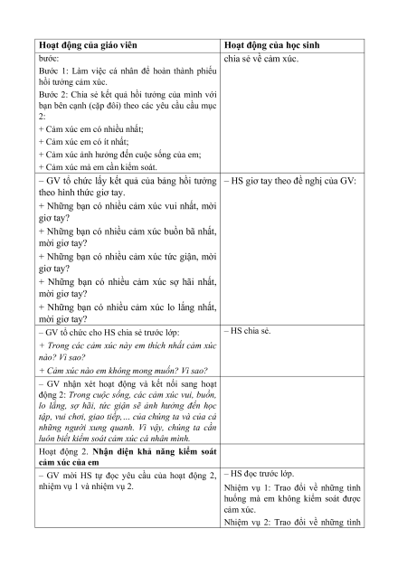 bản thân; hoạt động rèn luyện khả năng kiểm soát cảm xúc của bản thân.