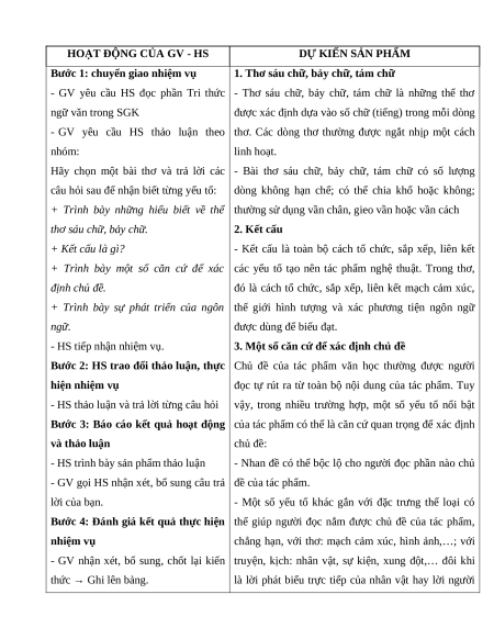 - GV yêu cầu HS đọc phần Tri thức - Thơ sáu chữ, bảy chữ, tám chữ là những thể thơ ngữ văn trong SGK