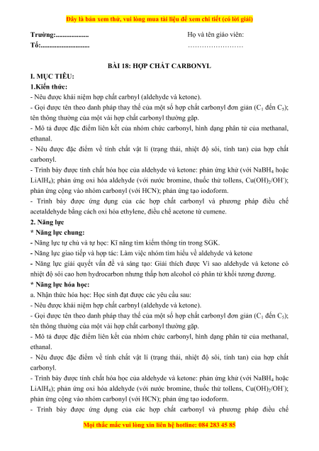 BÀI 18: HỢP CHẤT CARBONYL I. MỤC TIÊU: 1.Kiến thức: