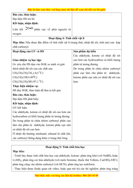 - Tính chất hoá học của aldehyde, ketone: Phản ứng khử , Phản ứng oxi hoá aldehyde, Phản