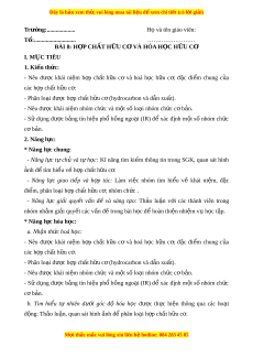 ế thông tin trong SGK, quan sát hình nh ả đ t ể ìm hi u v ể ề h p ch ợ ất h u c ữ ơ. - Năng l c ự giao ti p ế và h p ợ tác: Làm vi c ệ nhóm tìm hi u ể về khái ni m ệ , đ c ặ đi m ể , phân lo i ạ h p ch ợ t ấ h u c ữ ; ơ nhóm ch c ứ . - Năng l c ự gi i ả quy t ế v n ấ đề và sáng t o ạ : Th o ả lu n ậ v i ớ các thành viên trong nhóm nh m ằ gi i ả quy t ế các v n đ ấ t ề rong bài h c đ ọ ể hoàn thi n nhi ệ m ệ v h ụ c ọ t p. ậ * Năng l c hóa h ự c: ọ a. Nh n t ậ h c hoá h ứ c: ọ - Nêu đư c ợ khái ni m ệ h p ợ ch t ấ h u ữ cơ và hoá h c ọ h u ữ c ; ơ đ c ặ đi m ể chung c a ủ các h p ch ợ ất h u c ữ . ơ - Phân lo i ạ đư c ợ h p ch ợ t ấ h u c ữ ( ơ hydrocarbon và d n xu ẫ t ấ ). - Nêu đư c ợ khái ni m ệ nhóm ch c ứ và m t ộ s l ố o i ạ nhóm ch c c ứ b ơ n. ả - Sử d ng ụ đư c ợ b ng ả tín hi u ệ ph ổ h ng ồ ngo i ạ (IR) đ ể xác đ nh ị m t ộ s ố nhóm ch c ứ cơ b n. ả b. Tìm hi u ể tự nhiên dư i ớ góc độ hóa h c ọ đư c ợ th c ự hi n ệ thông qua các ho t ạ đ ng: ộ Th o ả lu n, quan ậ sát hình nh ả đ phân l ể o i ạ h p ợ ch t ấ h u c ữ ơ. M i ọ thắc m c