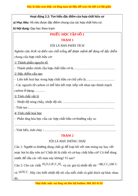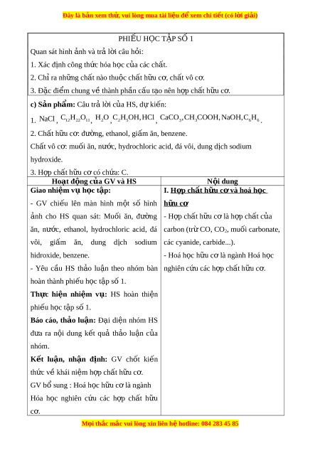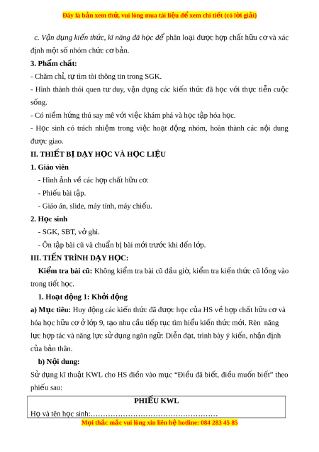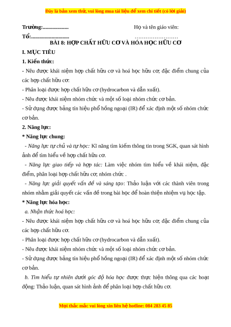 Đây là bản xem th , vu ử i lòng mua tài li u ệ đ xe ể m chi ti t ế (có l i ờ gi i ả ) c. V n ậ d ng ụ ki n ế th c, ứ kĩ năng đã h c ọ đ ể phân lo i ạ đư c ợ h p ợ ch t ấ h u ữ c ơ và xác định m t ộ số nhóm ch c ứ c b ơ n. ả 3. Phẩm ch t ấ : - Chăm ch , t ỉ t