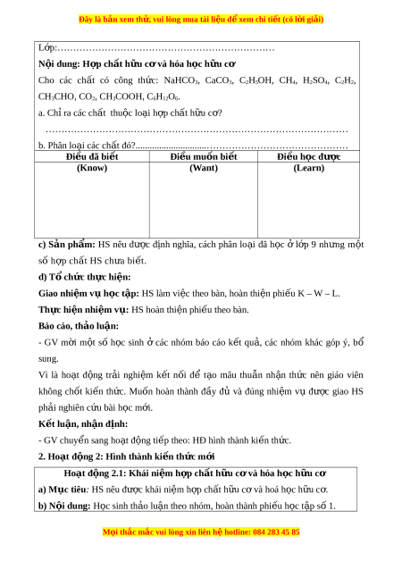 ể tra bài cũ: Không ki m ể tra bài cũ đ u ầ gi , ờ ki m ể tra ki n t ế h c ứ cũ l ng ồ vào trong ti t ế h c. ọ 1. Hoạt đ ng 1 ộ : Kh i ở đ ng ộ a) M c t ụ iêu: Huy đ ng ộ các ki n t ế h c đã ứ đư c h ợ c ọ c a H ủ S về h p ợ ch t ấ h u ữ c và ơ hóa h c ọ h u c ữ ơ ở l p ớ 9, t o nhu c ạ ầu ti p t ế c t ụ ìm hi u ki ể n t ế h c ứ m i ớ . Rèn năng l c ự h p t ợ ác và năng l c ự s d ử ng ngôn ng ụ : ữ Di n đ ễ t ạ , trình bày ý ki n, nh ế n đ ậ nh ị c a ủ b n t ả hân. b) N i ộ dung: Sử d ng ụ kĩ thu t ậ KWL cho HS đi n ề vào m c ụ “Đi u ề đã bi t ế , đi u ề mu n ố bi t ế ” theo phi u s ế au: PHIẾU KWL Họ và tên h c s