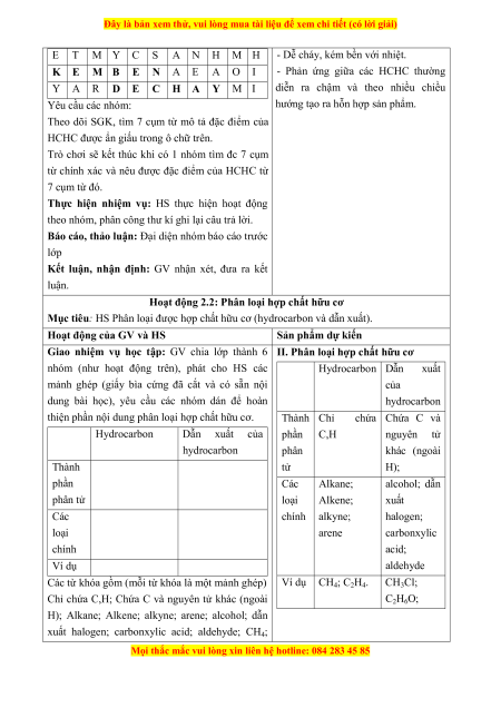 Mục tiêu: HS Phân loại được hợp chất hữu cơ (hydrocarbon và dẫn xuất).