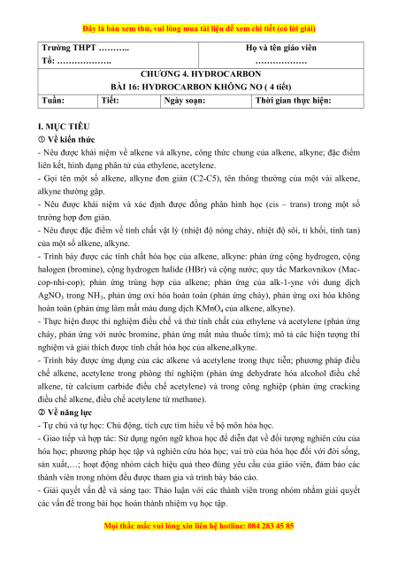 Đây là bản xem thử, vui lòng mua tài liệu để xem chi tiết (có lời giải) Trường THPT ……….. Họ và tên giáo viên Tổ: ………………. ……………… CHƯƠNG 4. HYDROCARBON