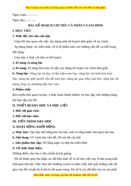 a. Kĩ năng: Kĩ năng tính toán, kĩ n n ằ xây d ng k ự ho ế ch ạ tài chính đ n gi ơ n ả b. Năng l c ự : Năng l c ự t duy và l ư p l ậ u n ậ toán h c; ọ năng l c ự mô hình hóa toán h c; ọ năng l c ự gi i ả quy t ế v n đ ấ ề toán h c; ọ năng l c ự giao ti p ế toán h c; ọ năng l c ự sử d ng công ụ c , ph ụ ư ng t ơ i n ệ h c ọ toán 3. Phẩm ch t ấ Rèn luy n t ệ hói quen t h ự c, ý t ọ h c hoàn ứ thành nhi m ệ v h ụ c ọ t p, b ậ i ồ dư ng h ỡ ng ứ thú h c ọ t p cho H ậ S. II. THIẾT B D Ị ẠY H C Ọ VÀ H C Ọ LI U Ệ 1. Đ i ố v i ớ giáo viên: 2. Đ i ố v i ớ h c s ọ inh: III. TI N Ế TRÌNH D Y Ạ H C Ọ A. HOẠT Đ N Ộ G KH I Ở Đ N Ộ G a. Mục tiêu: T o t ạ âm th h ế ng t ứ hú cho h c ọ sinh và t ng b ừ ư c ớ làm quen bài h c. ọ b. N i