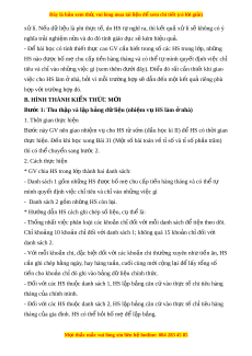 Bước 1: Thu th p và l ậ p b ậ ng d ả l ữ i u ( ệ nhi m ệ v H ụ S làm n ở hà) 1. Th i ờ gian th c ự hi n ệ Bư c này G ớ V nên giao nhiệm v cho H ụ S t s ừ m ớ (đ u h ầ c ọ kì II) để HS có th i ờ gian th c ự hi n. Đ ệ n ế khi h c ọ xong Bài 31 (M t ộ s bài ố toán v t ề s ỉ và t ố s ỉ ph ố n t ầ răm) thì có th chuy ể n ể sang bư c ớ 2. 2. Cách th c hi ự n ệ * GV chia HS trong l p t ớ hành hai danh sách: - Danh sách 1 gồm nh ng H ữ S đư c b ợ m ố chu c ẹ p t ấ i n hàng t ề háng và có th t ể ự mình quy t ế đ nh vi ị c ch ệ t ỉ iêu và ch vào nh ỉ ng vi ữ c gì ệ - Danh sách 2 gồm nh ng H ữ S còn l i ạ . * Hư ng ớ d n H ẫ S cách ghi chép s l ố i u, c ệ t ụ h l ể à: - Thống nh t ấ vi c phân l ệ o i ạ các kho n ả ch đ ỉ i ố v i ớ m i ỗ danh sách đ t ể i n t ệ heo dõi. Chỉ kho ng ả 10 kho n ch ả đ ỉ ối v i