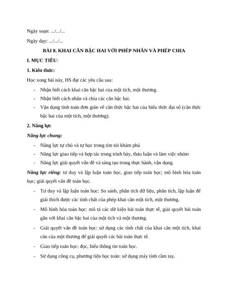BÀI 8. KHAI CĂN BẬC HAI VỚI PHÉP NHÂN VÀ PHÉP CHIA I. MỤC TIÊU: