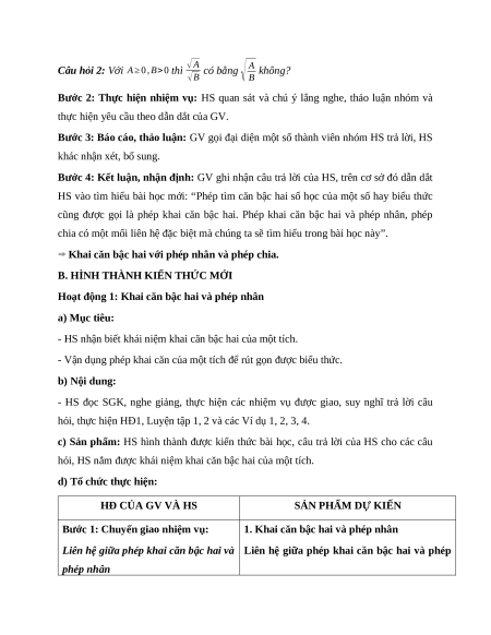 Hoạt động 1: Khai căn bậc hai và phép nhân a) Mục tiêu: