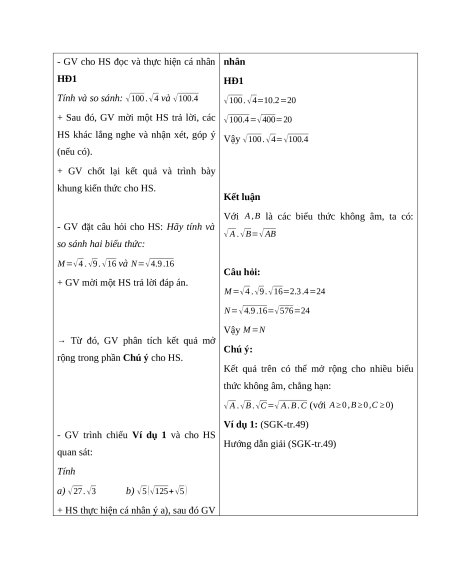 Giáo án Khai căn bậc hai với phép nhân và phép chia Toán 9 Kết nối tri thức