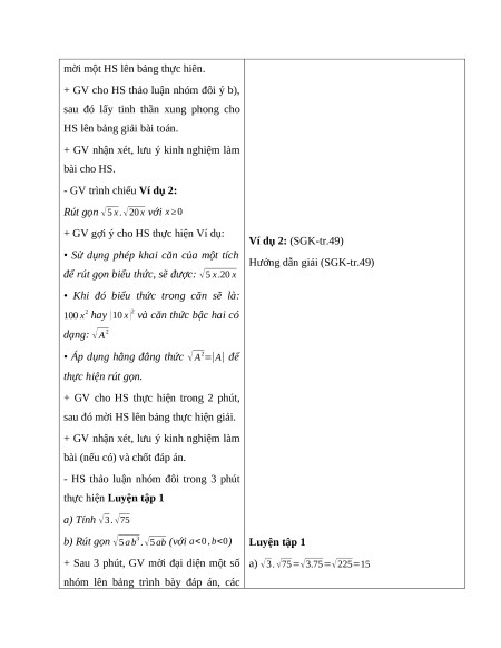 - Vận dụng phép khai căn của một tích để rút gọn được biểu thức. b) Nội dung: