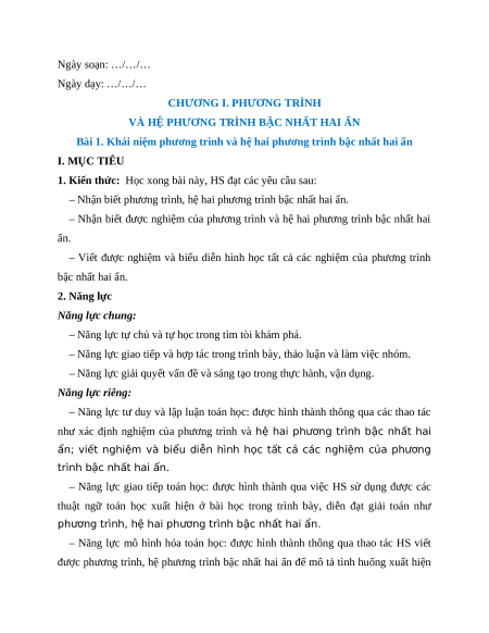 Bài 1. Khái niệm phương trình và hệ hai phương trình bậc nhất hai ẩn I. MỤC TIÊU