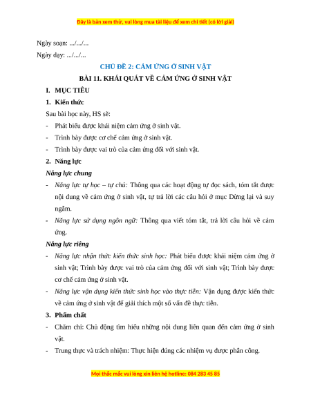 BÀI 11. KHÁI QUÁT VỀ CẢM ỨNG Ở SINH VẬT I. MỤC TIÊU 1. Kiến thức Sau bài học này, HS sẽ: