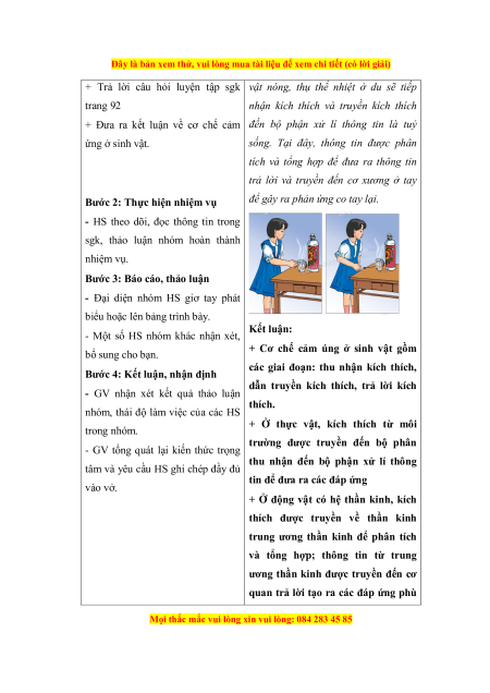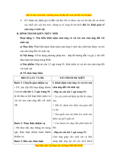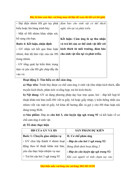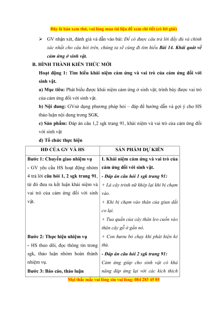 c) Sản phẩm: Đáp án câu 1,2 sgk trang 91, khái niệm và vai trò của cảm ứng đối với sinh vật d) Tổ chức thực hiện HĐ CỦA GV VÀ HS SẢN PHẨM DỰ KIẾN