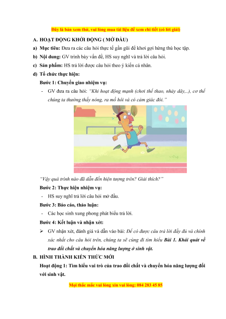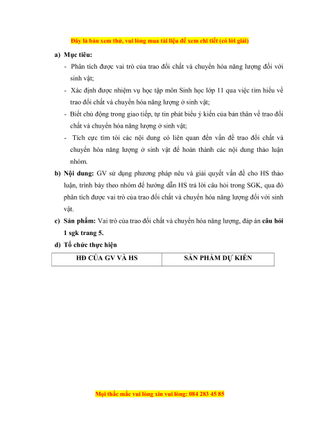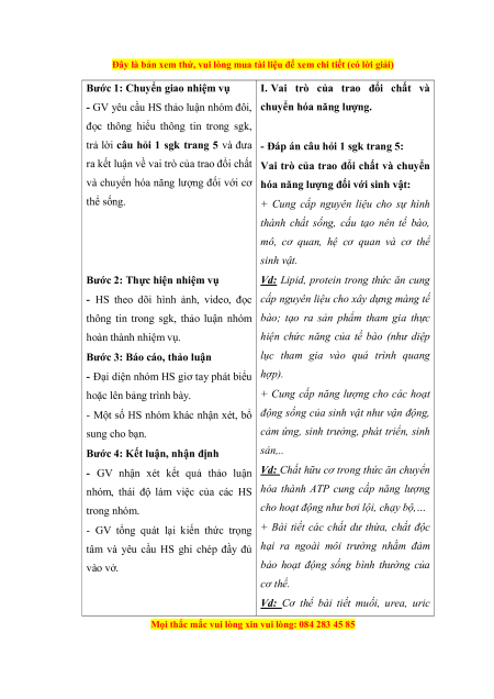 c) Sản phẩm: Vai trò của trao đổi chất và chuyển hóa năng lượng, đáp án câu hỏi 1 sgk trang 5. d) Tổ chức thực hiện HĐ CỦA GV VÀ HS SẢN PHẨM DỰ KIẾN