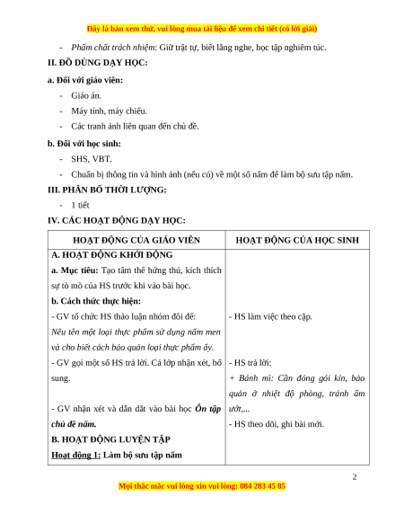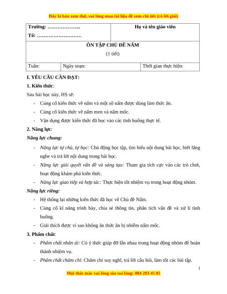 ÔN TẬP CHỦ ĐỀ NẤM (1 tiết) Tuần: Ngày soạn: Thời gian thực hiện: