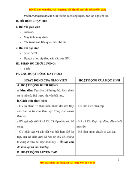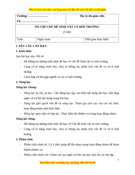 ÔN TẬP CHỦ ĐỀ SINH VẬT VÀ MÔI TRƯỜNG (1 tiết) Tuần: Ngày soạn: Thời gian thực hiện: